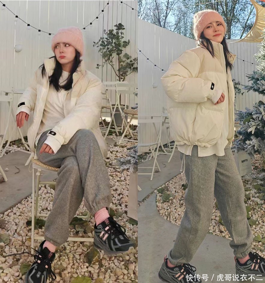 像这身白色羽绒服配洞开裤的穿搭,就能令东谈主合适的开脱繁重感,穿出利落帅气的体态。其中因为外衣主要应用短款贪图,不会有向下移动重点的作用,即使裤子聘任宽松版型,也不会使东谈主展现出邋里暗昧的嗅觉。