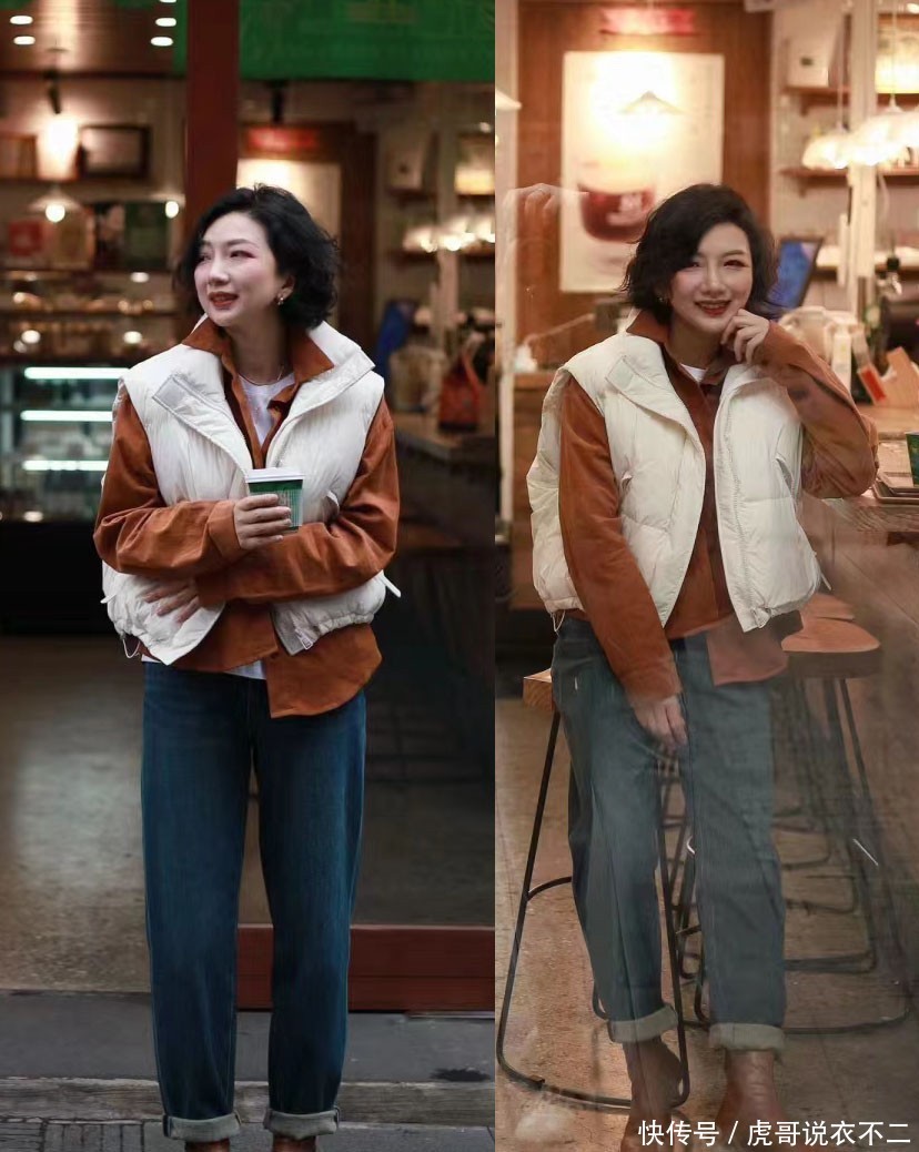 像这身叠穿的冬季穿搭中,白色羽绒服马甲对应了打底上衣,而棕色衬衫则与皮靴变成了凹凸的衔接成果,这么看起来不仅头绪分明,还使造型有水乳交融的调解感,前锋又高等。